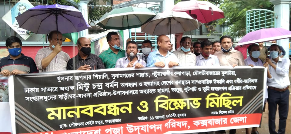 বুধবার (১১ আগষ্ট) বিকালে কক্সবাজার পৌরসভার প্রাঙ্গণে জেলা পুজা উদযাপন পরিষদ ও জেলা হিন্দু বৌদ্ধ খ্রিস্টান ঐক্য পরিষদের উদ্যোগে এই মানববন্ধন ও বিক্ষোভ মিছিল অনুষ্ঠিত হয়।